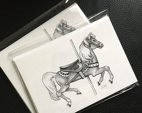 Carousel Horse Design – Featuring the pencil drawing art of illustrator, Lorraine Dey (Qty. 4 – 3.5″ x 5″ cards, with 4 envelopes included per pack) $5.00 Pricing below includes a $1.00 shipping fee.