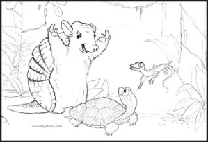 Raven Tree Press has contracted my book “Hector-Armando’s Big Rain Forest Party”, (working title). It is scheduled for a Fall 2011 release and I will be spending this year creating all of the illustrations for this book about a little armadillo. I plan to keep a journal as both the author and illustrator, and will include information on the “process” in future posts. This first post is where I start working… the rough story boards and cover designs.